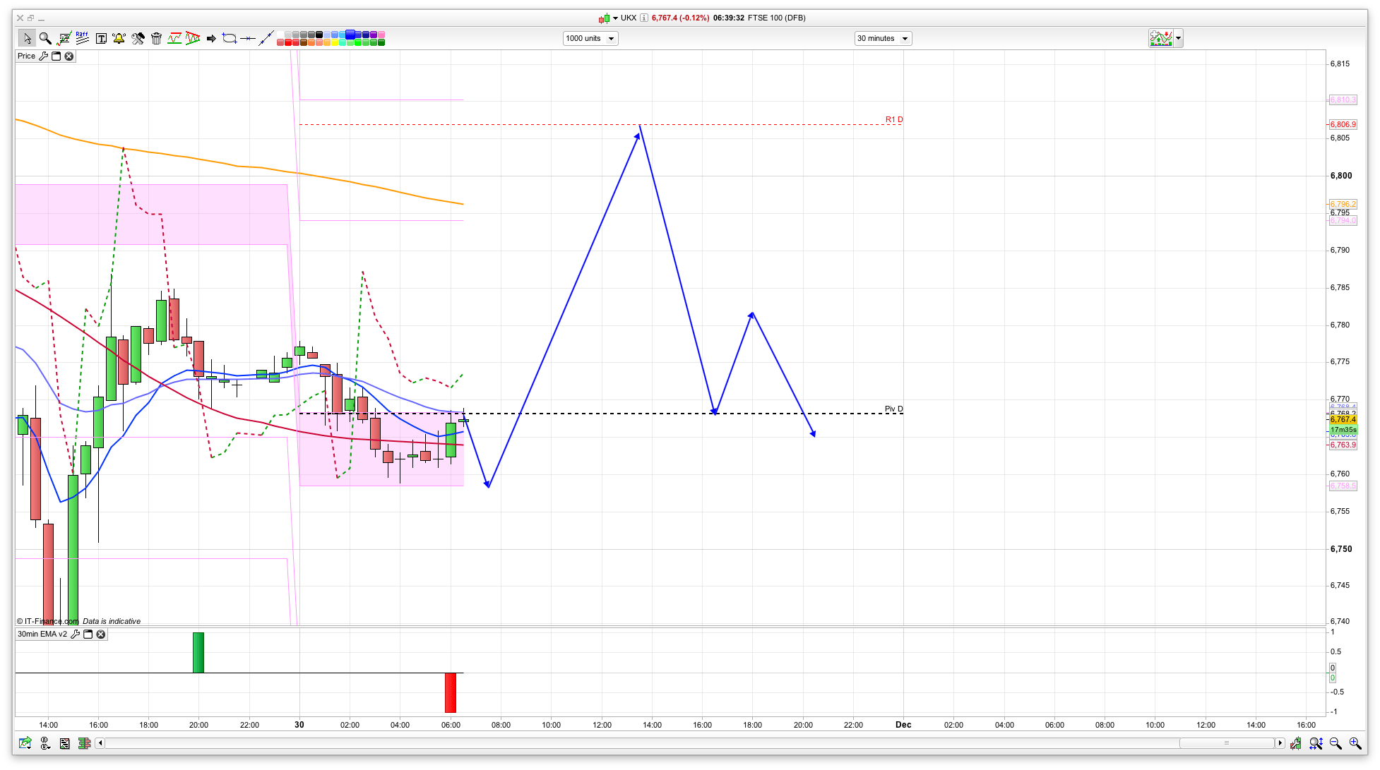 For support we have the bottom of the 10 day Bianca at 6770 – pretty much where we are as I write this, with a bearish looking 30min chart to start with, though the 10 min chart has some weak bull to start with.