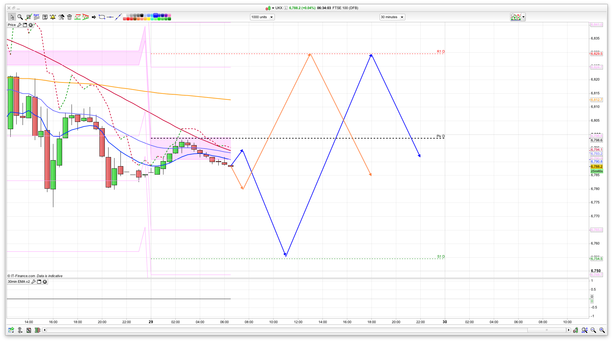 Anyway, back to today, and I am expecting a bit of a climb first thing to follow the blue arrows. If 6770 breaks then 6757 is pretty likely. Below that then 6660 is definitely on the cards. If the bulls break 6830 then 6869 and 6885 are the next levels of note.