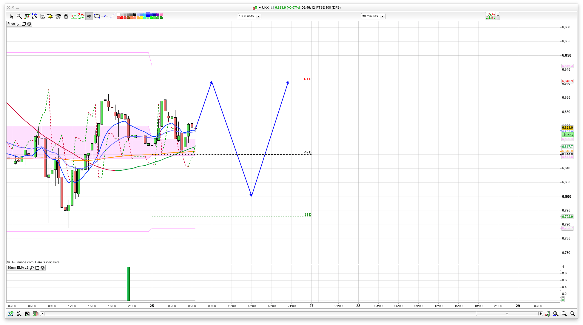 Its a Friday after a US holiday so might be a little bit weird as things settle down again. We have initial resistance at 6840 with R1 and also just above the Hull moving average (and yesterdays high). Support is at 6815 where we have the pivot, the 200ema on 30min, and a green coral on 30min also. This area has held as support overnight. A dip below this might well see the 10 day Bianca channel bottom at 6799, which could well be a place to try a long from in case we are on a move up towards 7000. The rise yesterday from the support at 6790 was pretty slow, but it did rise so there is still some buying momentum.