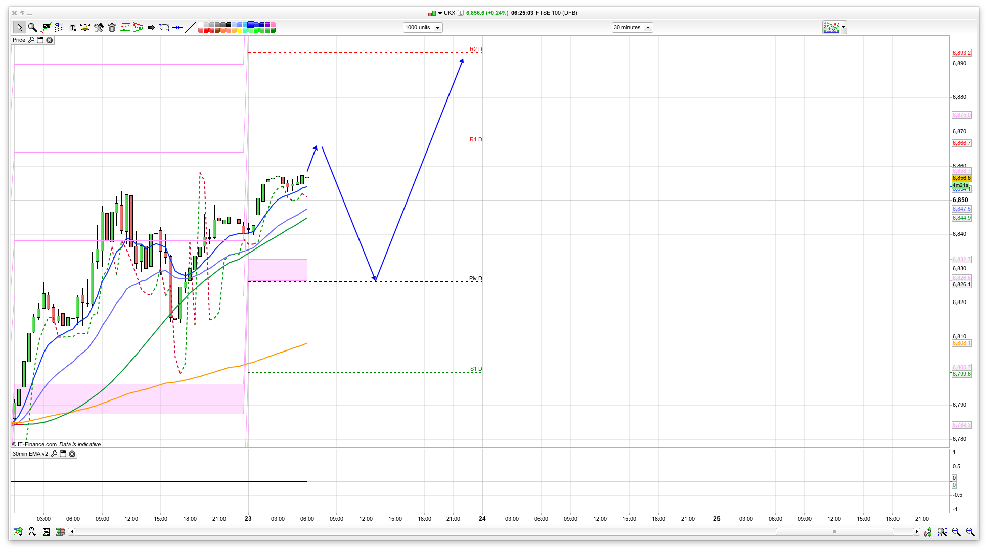 Support is at the pivot at 6826 initially, with 6799 below that where we have S1. The pivot may well hold for a long entry, but if the usual scenario plays out it will overshoot before climbing back. 6799 would be a good spot to long from if seen also, with a stop around 6785. The bulls are just breaking above the 25ema on the daily at the moment (6849) so if they can hold above that area with a decent close today then we could see some impetus for further upside towards 7000.
