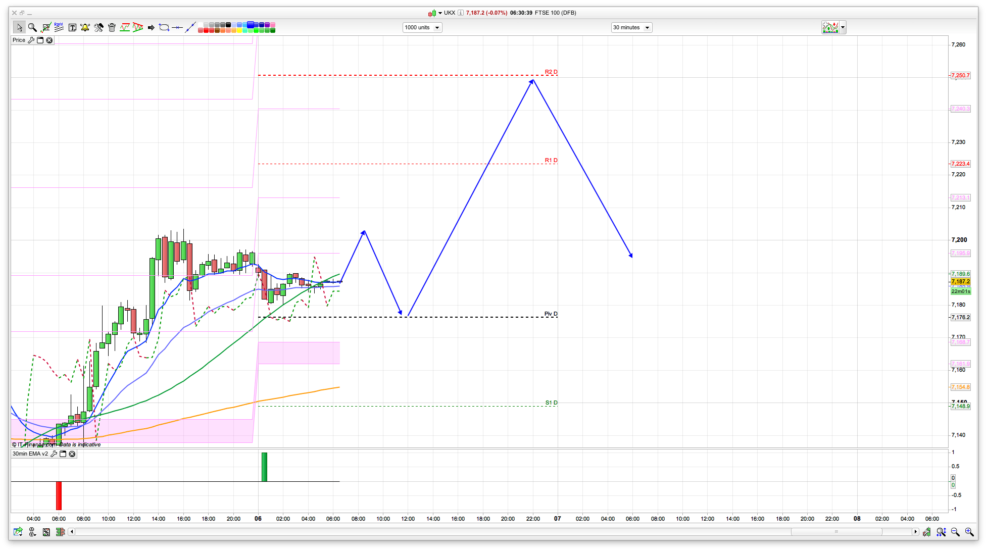 For today I am looking at Fridays resistance and the daily pivot at 7175 to hold as support on any initial dip and then a rise towards the 7248 level. I am thinking we will get a dip back from here towards 7200 before we get a bit more a bullish push up over the next week or so. Certainly for today those are the two levels that are of immediate interest. Below 7175 then we have support at 7149 on the 2 hour.