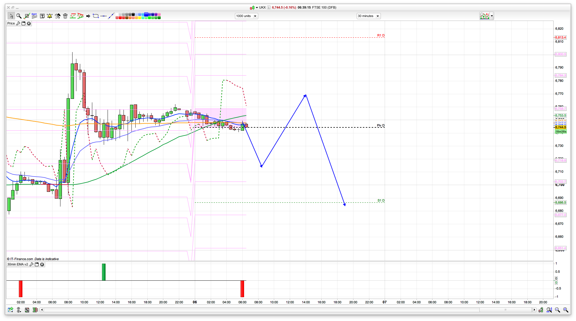 With the top of the 10 day Bianca at 6766 and the weakness remaining overnight since the drop back yesterday, I think we will test the 6713 support at some point this morning, mainly as the 10 minute chart is starting off bearish, with 6749 resistance. The 30min chart has also given me a sell signal at 6747. They can be a bit unreliable out of hours though, so something to consider but not rely on. The 6713 level is off the 2 hour chart which has gone bullish after the rise yesterday, and might well see some buyers come in at that area. The two main levels I am therefore watching today at 6713 and 6766. Wider levels are 6680 and 6790.