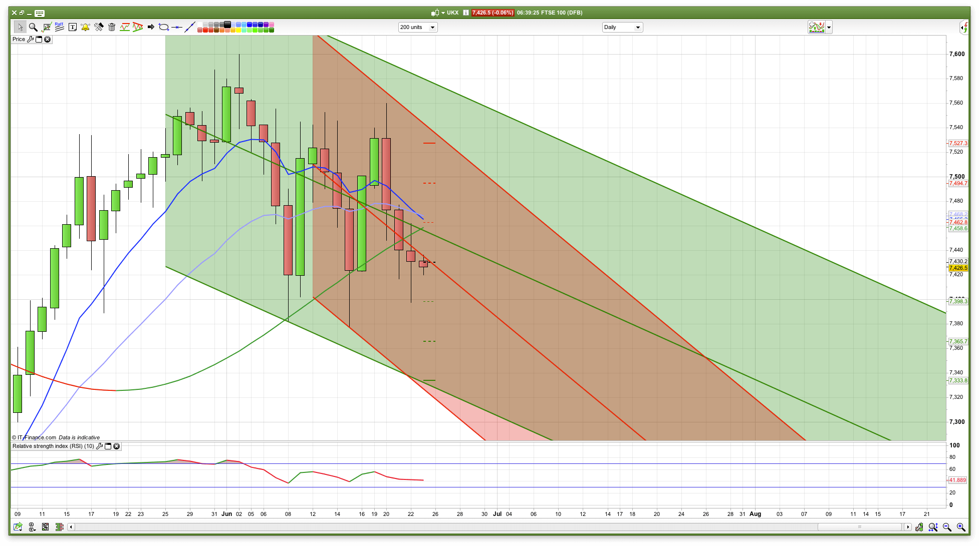 No break of support on the open so think this treads water until this afternoon now. What bears want to see is price holding in the 7400-7420 area so that if selling pressure comes in from the US later on we take out support. Just checked out the Dow and would be surprised if it manages to eek out another up day so maybe that move is on today… a break of support closing on the lows for the week would suggest more downside next week