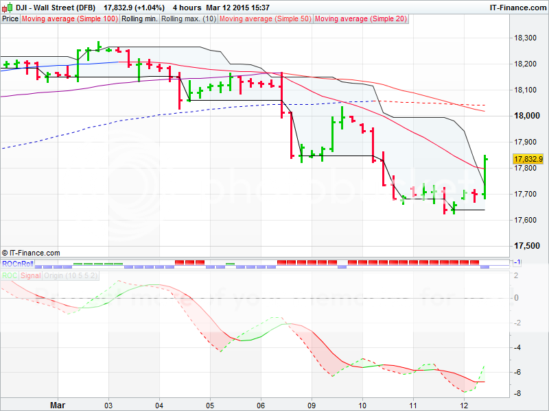 Dow/4hrs. — A lot clearer now; coming off support @ ≈ 17630 quite vigorously — expected to head for 18000 in the short term. ROCnRoll status should change to long shortly. 😉