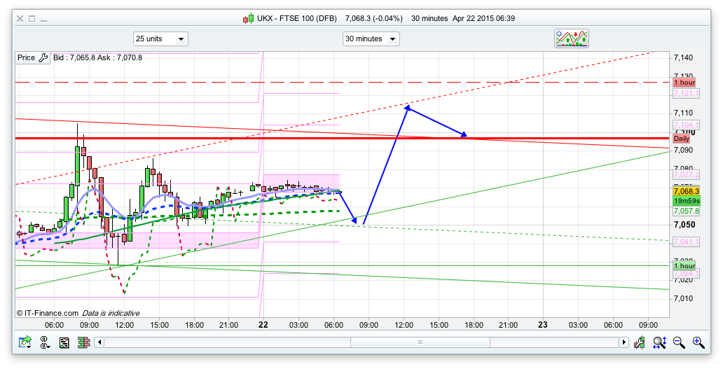 Good morning. Well once again all the FTSE action seemed to be a bit all over the place. When i was doing yesterdays analysis I could see the rise to 7100, but after that it wasn’t so clear. I should have “guessed” that it was going to sell off as we saw a 70 point fall. I did think though that with that strong rise first thing we would get the 7120 for the better short entry. Oh well. The bulls fought back anyway and regained the 7070 area overnight. We have had a pretty decent Asia session overnight, and the S&P has climbed off yesterdays pivot at 2096 (only a little bit though!) so I wouldn’t be surprised if we have a decent up day today. Unfortunately I think the FTSE is a little jittery at the moment, and probably will be till the election, though Europe as a whole is on tenterhooks as the Greek saga lurches from one headline to another. It was Greece that triggered the dip from 7100, with the ECB rumouring a reduction of support of the Greek banking sector. Then comments from EU’s Dijesselbloem were of a very accommodative and bullish tone indicating that developments in the negotiations gave cause for optimism. Wouldn’t be surprised if the news and comments are just “playing” the market.