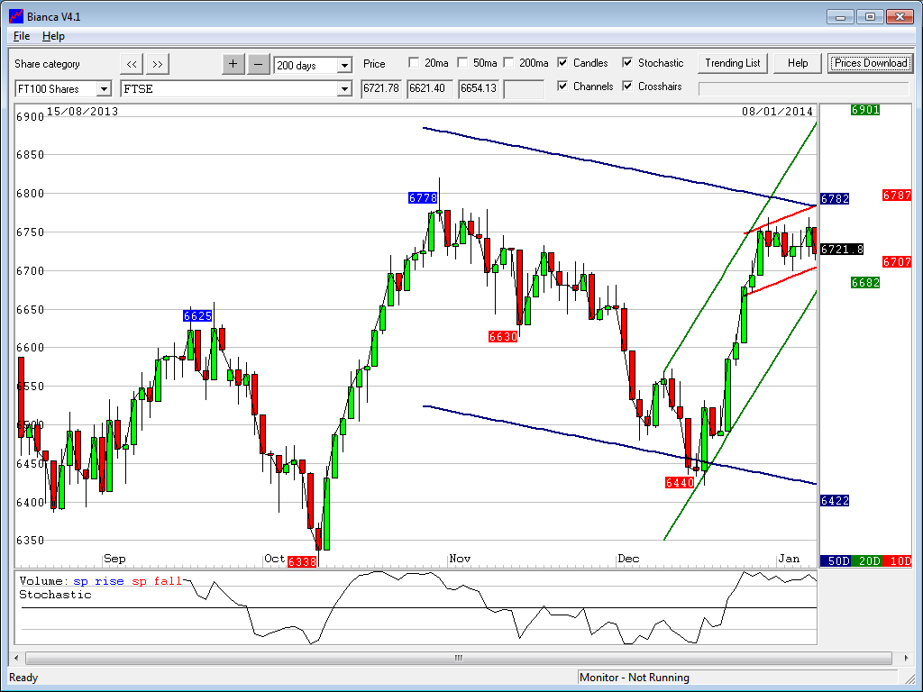 Oh FTSE bulls, don’t give up just yet, we want the weekly chart to play out with the rise to 6850! Crucial level today is 6712 (yesterday’s low) which as long as that holds then could get the top of the 10 day Raff at 6777. Unfortunately if it doesn’t hold then 6670 and 6627 look possible supports next. Assuming it does hold then 6730ish (pivot area and channel top on 30 minute) will need to break to target 6760 and 6777. The EMAs are bearish for the start as I write this, and we are within a fairly tight declining 30 minute channel. I have put a fairly zig-zaggy arrow scenario below, basically based on the 6712 area holding. I think it will, as I think NFP will be ok tomorrow, there will be a test of the top of the 10 day channel top. The 10 day Bianca channel top has dropped down to 6787 now as well so its definitely turning bearish and that weekly scenario below might play out a bit earlier, failing to reach the 6850/950 top of the weekly channel. I am still thinking a decline to 6000 during the first half of 2014.