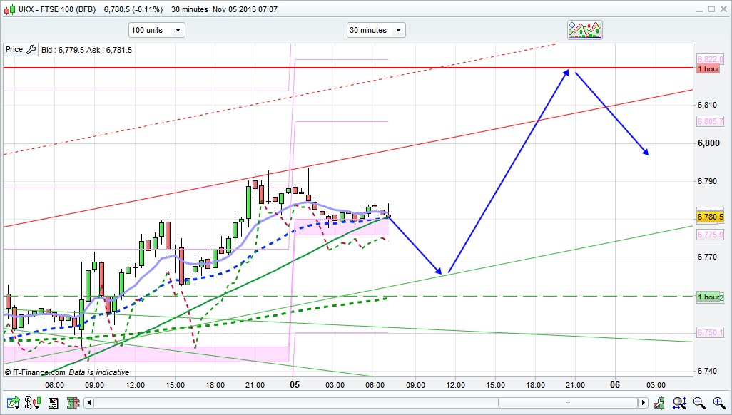 Today’s pivot is 6759 so I expect that to act as initial support, and with the lack of any major bear action off 6790 I expect that we may well break through 6800 early this morning. I have the top of the Bianca 10 day at 6815 though so I feel that a short there is a fairly decent bet. that said, as with the Dax, we are within a pretty decent ProTrend channel on the 30 minute chart, with the extremes at 6805 and 6763, so a long at the bottom of that range (and also the pivot) could also be a bet worth taking.