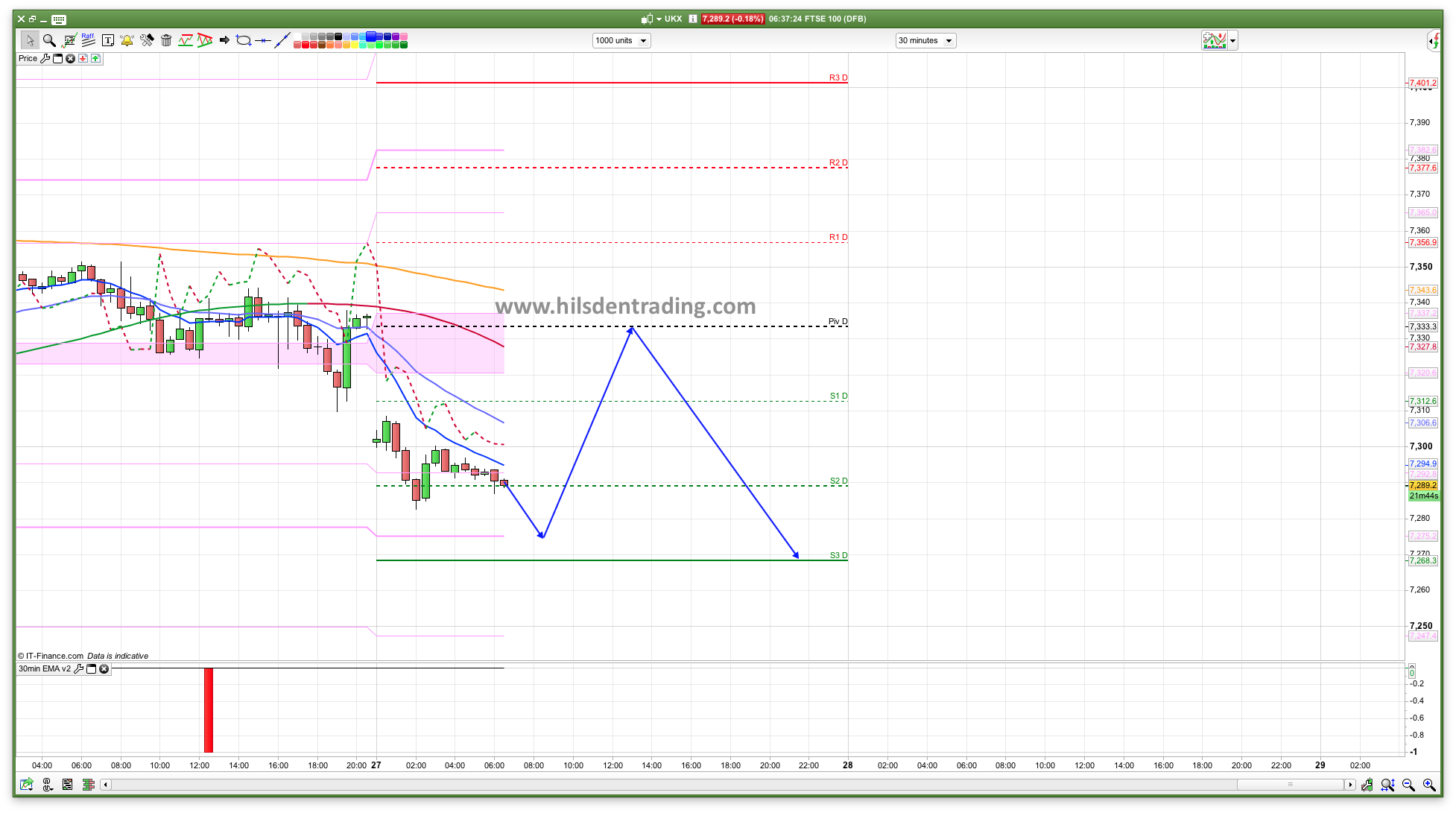 For today therefore I am watching the 7275 level for support, and then 7343 for resistance. I am also expecting possible resistance level to play out at 7305 which might temper any early rise.