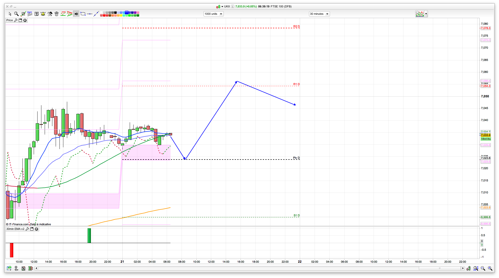 Good morning. Bulls finally showed up at just below 7000 yesterday for a quick run up to the 7040 level where it then stalled and remained for most of the session. Bit annoying that the 7023 resistance level was just missed first thing as it dropped to 6992 but broke the second time so the short took a small hit. Frustrating – that was off the 2 hour chart as well which is usually pretty good. Being a fairly low volume week some overshot is expected at the levels though. I still think that buying the dip this week is the best plan though to target 7065 and possibly 7100.