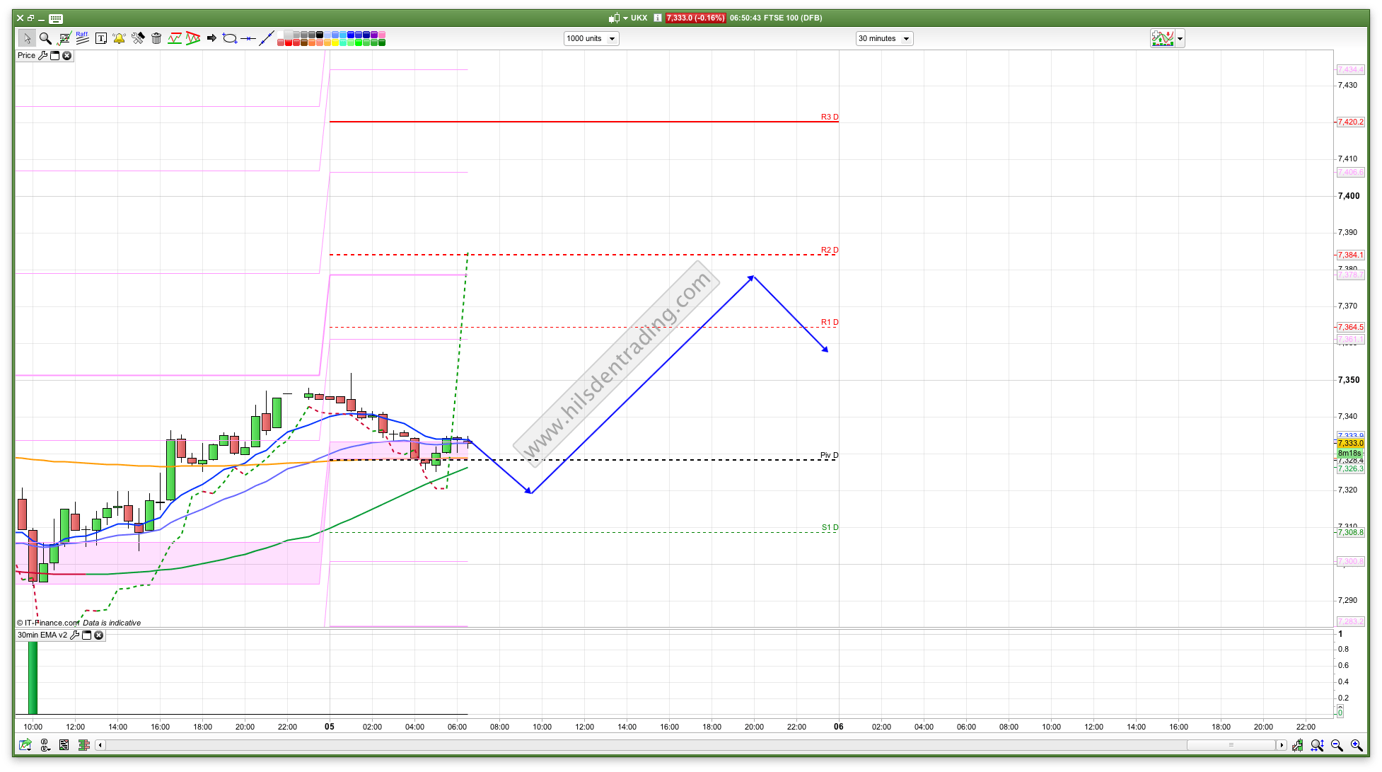 Overnight it has managed to push up to 7350 but has now dropped back. The SP rise stalled at our resistance level at 2359 and dropped a bit, taking profit off at 2355 being the right thing to do as the bulls fought back. The ASX200 had a dip and rise session today, so the FTSE100 may well follow suit, and we have some fairly key resistance at 7375 today.