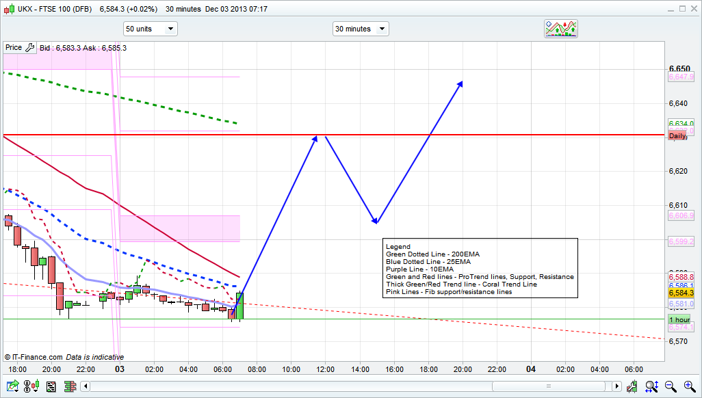 Good morning. Slightly frustrating yesterdays as the drop started from 6660, and I had my short order at 6670. Such is the game sometimes. The FTSE bears came out in force from that level though and despite the support levels holding for a while, once the US started to dip later in the day the FTSE didn’t stand a chance. Slow to rise, quick to drop and slightly out of step with its US masters. Eurozone news started off not being great yesterdays with Spanish PMI coming in below forecasts, but then improved with each bit of news after that. Not that it had that much effect, even hitting the bottom of the 10 day Raff at 6591 didn’t generate much of a bounce, so its fairly safe to say that the bears are holding the cards at the moment. However, everyone’s still standing by for the “Santa rally” if it comes this year. I think it will, but late – probably something like the 23rd December.