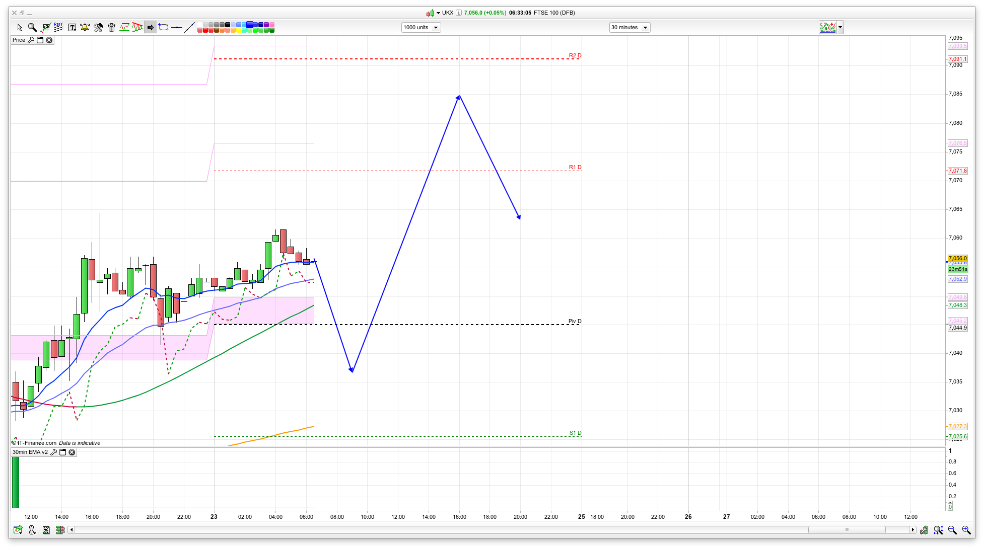 We also have the daily pivot for support at 7045, just below where we are looking at opening. With that flat to slightly bullish day yesterday the 2 hour chart has once again changed to bull, showing support at 7052, pretty much where we are as I am writing. Overnight has remained fairly static at the 7055 level. Lower support is at the 200ema on the 30min at 7027.