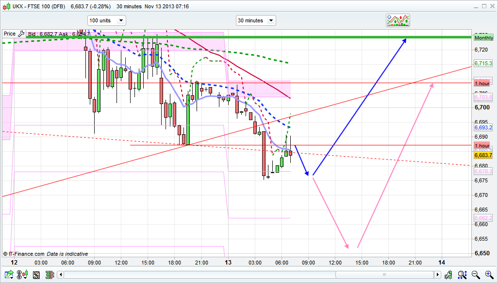 Good morning. Well the long worked out ok in the end but it was fairly hard going, I held it open over the close to collect the dividend (a useful 11 points yesterday), but with prices then dipping back closed it at 6700. There wasn’t even that much buying from the divi hunters at the close yesterday. Overnight we have dipped below the 20 day Bianca channel for today at 6689 and have bounced up off the 10 day so far at 6676. Inflation data out yesterday came in at 2.2% for October, below the forecasted 2.5% and the lowest level for more than a year. Generally the UK is enjoying some decent data at the moment with UK growth “firming” according to the OECD. I take it all with a pinch of salt though, as these forecasters are the same ones who said that austerity in Britain was strangling it earlier this year and that the government needed to change their policies. They didn’t and now the data is improving with the UK likely to be the fastest growing G7 economy. So all good then? When the media are all uber bullish time to be a little cautious, though with the price hitting the bottom of the 10 day channel and bouncing a little there is still the possibility of a 6746 test (top of the 10 day channel).
