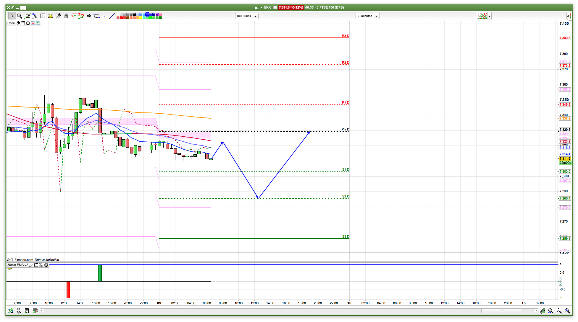 Good morning. Well the bulls failed to break 7355 yesterday in what was overall a pretty weak session, especially just after the close with a decline to 7315 where we have remained overnight. Twice the bulls tried to push past 7355 and were rebuffed on both occasions, which opens the door for a test of the bottom of the Bianca channels at 7303 and 7285 today. Cable and gold also both fell, with the link between cable and the FTSE 100 appearing weak again – past few months have seen the FTSE rise when cable fell as it helps FTSE 100 companies having a weaker pound.
