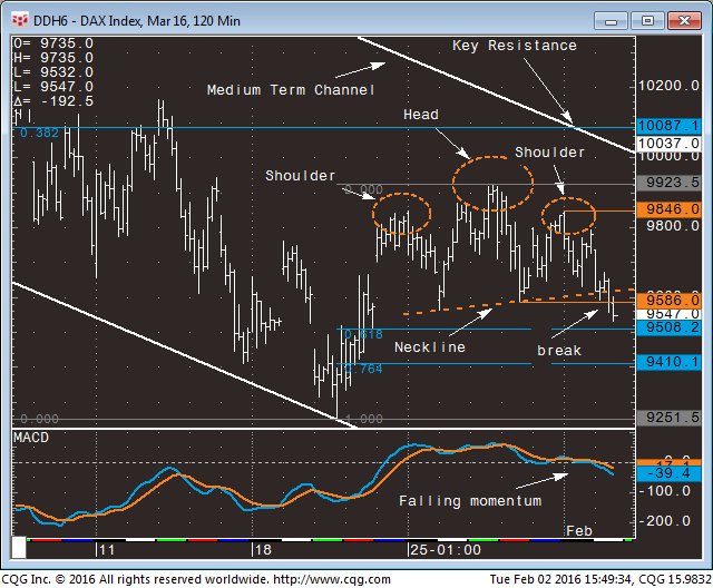 While we are all looking at short term profits, which is the name of the game, is there not a near perfect Head & Shoulders on the daily with the base of the left shoulder going back to Dec 2014, top of the head is post Scottish Election @ 7140, with the market sniffing at sub 5800 earlier in the week, that area looks like the neckline with a clean break of that down to under 5300. It only becomes invalid with a move above 6150ish which would tie in with the recent high of the last week at 6128. As a punt with a view I’ve bought the Feb 5500 puts @16 for 50 lots. Max downside is 10% of my account, with these swings on a daily basis RR looks good?