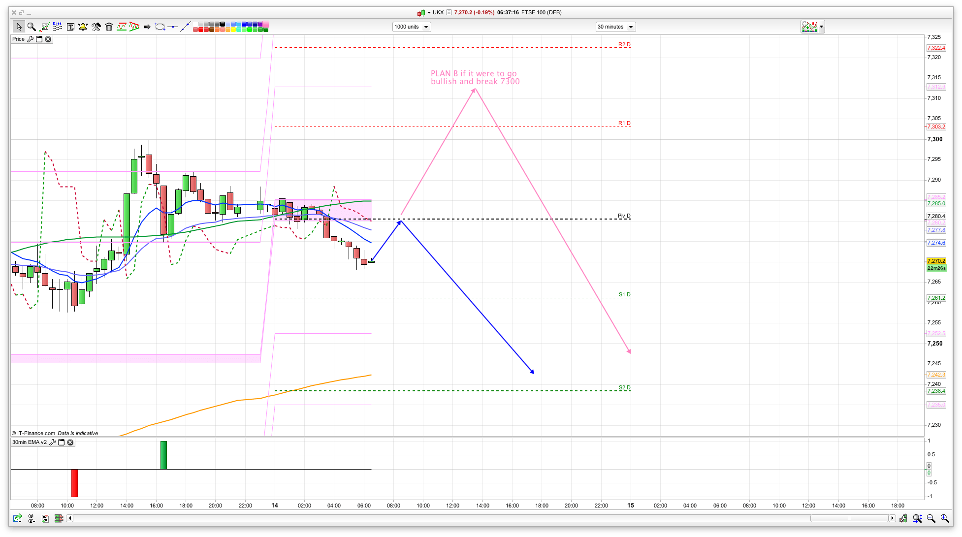 I am going to go with a bear Tuesday plan for today so looking to short at the 7285 area initially for a run down to the support area at 7250. With any luck it might go lower to the 7220 area. I have resistance at 7280 and 7290 so have split the difference for the entry. If the bulls want to scupper my plan then they will be wanting to break yesterdays resistance just shy of the 7300 level, however, that then opens up the 7312 resistance area where we have a fib pivot and also the 10 day Bianca channel (7308). Tomorrow has a large 28 point divi so likely to see a rise for that, so today the bears could do with stepping up to the plate. We also have a daily RSI of 65 again, having dropped off 69 from yesterday.