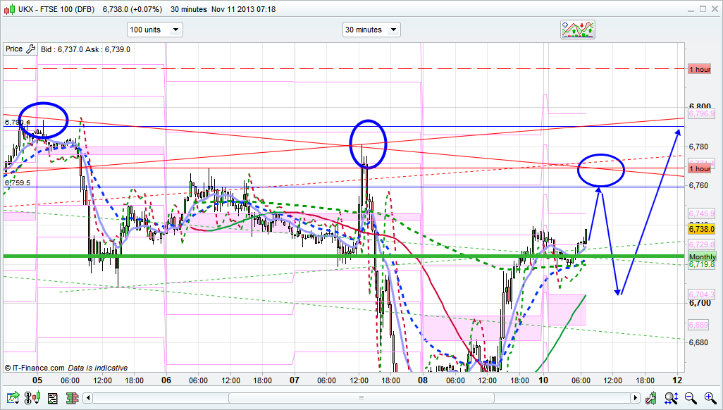 After Fridays moves, the momentum is still with the bulls for the moment, however, with the rush of recent high profile IPOs (often signifying a market top) of Twitter, Merlin, Royal Mail, it will pay to not fall in love with the upside. We have lots of data out this week (starting Tuesday) as mentioned above, all of which is largely expected to be bullish. For today I expect that we will almost definitely hit 6759, maybe after an initial dip to the 6720 area where we have the SafeZone on the 30 minute chart. The key level for the bulls to hold if we do dip from the 60 area will be the 6700 and if that breaks then we won’t be seeing 6790 anytime soon. The main play therefore is the short from that 6759 area. If 6700 does break then the daily pivot at 6668 is likely to be hit. I have the 6760 area as the top of the 10 day Bianca, and it is also a ProTrend channel and general “join the highs” line as shown below by the 3 blue circles, albeit with the ProTrend line showing 6768 so slightly higher.