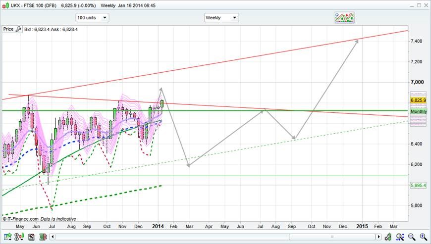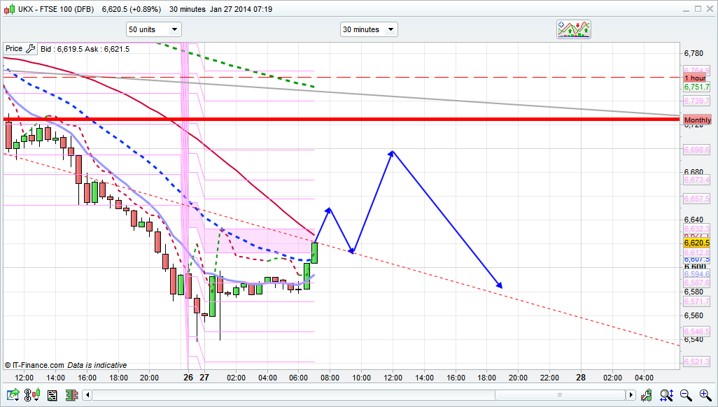 Finally turning out to be a decent January for me as have been short from effectively 6710. Now looking to go long at the end of the month right upto the end of April. In the short term 6530 and 6460 are targets this week for an entry point to a medium term target of 6900 by the end of April.