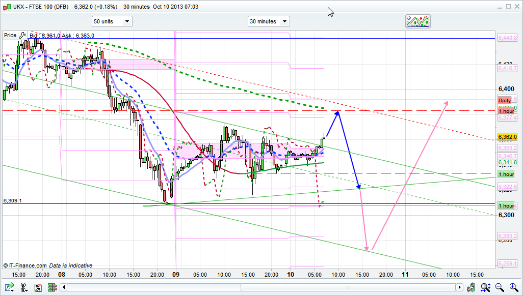Good morning. The FTSE just missed my shorting area at 6385 yesterday and then fell away which was a tad annoying. I had expected a retrace to the 61.8% line of Tuesdays falls, but in the end it only managed to get to the 50% line, around 6370. Here was a bit of weird price action just prior to the close when the price was driven down quite hard, almost retesting the 6310 area mentioned, but soon bounced back, thus making it look like a bit of a stop killer. I didn’t get it on my charts but yesterday several people in the chat room experienced a ghost spike on the FTSE to 6600. Ghost spikes have a habit of coming true so bear that in mind over the next month or 2. Obama officially put forward Janet Yellen for the Fed chair job, a move that will see a fairly uninterrupted continuation of Bernanke’s policies of money printing. The impasse in the US continues and while the politicians faff about 800,000 government workers don’t get paid, still, be small fry compared to the fall out if they don’t raise the debt ceiling.