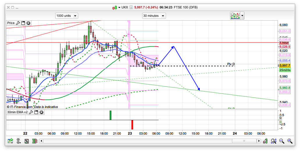 We moved a little bit higher than the 6045 resistance area I had for yesterday but the bears managed to fight back and we have dropped off again overnight, and also are just sticking the nose below 6000 as I write this. The 2 hour chart is still bearish, whilst the daily is just crossing to bull, with support at 5898, and as I mentioned yesterday I do think we will get a pull back after the rise from 5500 before we push too much higher – we rose a bit too far too fast in the past 10 days, and on nothing really. For today the 30min has gone bearish with resistance at 6006 and then 6026 just above that – a level that I feel would be a good entry for a short for a dip to the 200ema on the 30min at 5960. There is a chance that we will dip further however, I think that would be decent support if seen today as we have some PRT supports here also. Psychologically, 5950 is likely to be a decent level for the bulls to have a go at 6000 from also, as well as the 10 day Bianca at 5947. That said, if it breaks then 5898 is pretty likely. So, for today, weak bull to start with but favouring a bit of a pull back, ideally from 6025.