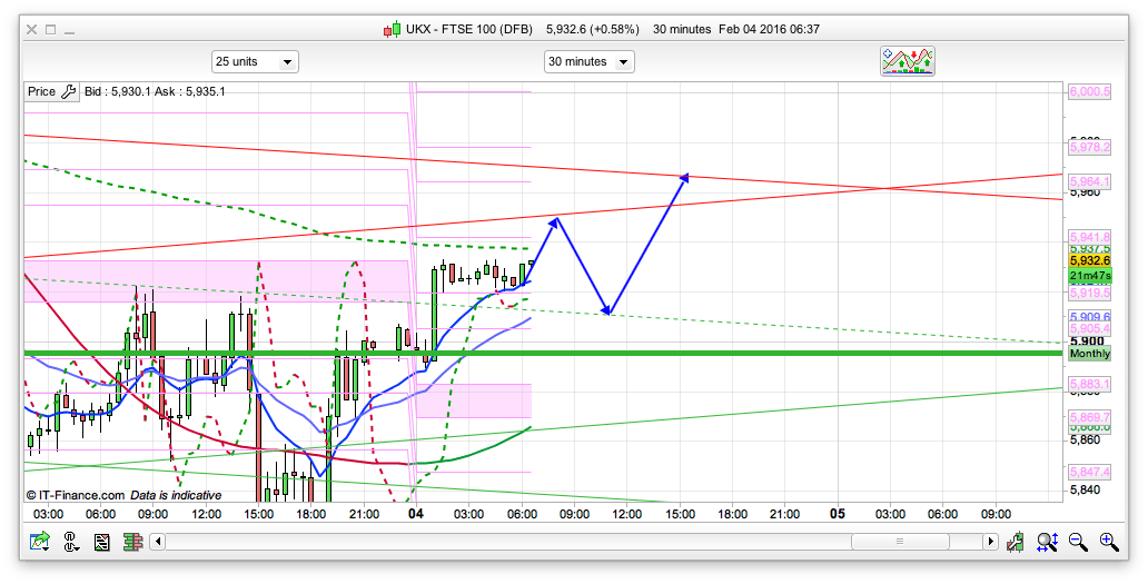 That was quite a sharp move down yesterday from 5920 to 5790 before an equally sharp recovery to bring us back above 5900. Certainly tricky conditions at the moment, though the long earlier in the day from the 5868 area worked out well for a gain. Volatile has certainly been the trend of the year so far! For today it actually looks fairly positive though there is resistance first thing at the 5945/5950 area so we may see an initial dip, which would work out well to test the 25ema on the 30min at 5910ish, which would be a decent long entry. Its NFP news tomorrow so something to bear in mind today and tomorrow morning, generally at the moment the news flow is fairly positive. Oil is holding steady around the $32 area as well. We have a pretty decent rising channel on the 10min chart as well at the moment with a rise to 6000 showing as possible, and with a cluster of resistance levels around here the bulls might have a bit of a job here. If it goes really bearish today (don’t think it will) then 5827 is the bottom of the 10 day Bianca, with 5800 bottom of the 10 day Raff. So, fairly simple trade plan at the moment, short term looks bullish up to 6000.