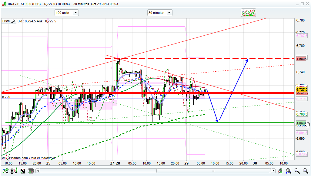 Today’s pivot is 6723, pretty much where we are as I write this. 6740 is today’s line in the sand – the bulls will be keen to break that to test higher levels, maybe even 6800. However, on the flip side, a break of 6700 flashes some warnings and could lead to 6670 and then lower. Once the daily channels (raff and Bianca) start breaking then there is going to be quite strong downward momentum. As I mentioned at the beginning of this email, I do think we have a little bit more bull left in the tank, and then the declines are more likely to start next week. we are having a bit of consolidation currently, hopefully for a little bit more of a push higher. The 6700 level has held a couple of tests on the 25th and the 28th October, and I think it might hold just a while longer. Initially this morning it does seem to be holding up ok, though I have plotted an initial dip, mainly based on the fast that he coral is red, and the EMAs are bearish. There is a ProTrend resistance at 6731 which is where I think it might initially dip from. If the price can get above the 6740 level then we should have a few more positive sessions remaining.