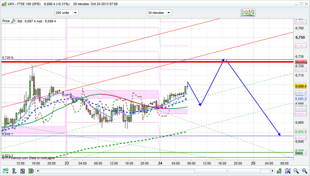 Good morning, the 6660 level has held for the moment but we had a very flat day yesterday, consolidation really after the rise on Tuesday. I still expe3ct just one more high before we start a down leg, and probably a retest of the 6720 area. FTSE has held up pretty well overnight and regained 6690 as I write this. we have jobs news out in the US at 1330 today and a few other bits so we will get some volatility around then. tomorrow see UK GDP news released which I think will be fairly positive. Talking of news, as you probably saw, news broke last night that the US had been bugging Merkel’s phone – that went down like a lead balloon! Looking at the daily chart, the 10 day Bianca channel is very narrow with the top at 6747 and the bottom at 6686 so I expect that to break sometime soon, and then the 20 day to come into play. I am leaning slightly towards the bottom of that channel breaking once we retest 6720 or maybe slightly higher – so still cautiously bullish for the moment.