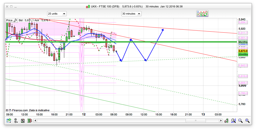 We had a very good bounce off the double bottom low at 5840 last night, and the usual overnight declines haven’t been as steep as they have been so far this year. As such, if we test 5850ish then I think that this is worth a long around here for a run to 5900+. Initially the 10 and 30min charts are showing as bearish, but with resistance on both around the 5900 level so this is the key level for the bulls to break this morning. Interesting article from Goldman Sacs here – the others are all in panic mode (RBS said sell everything yesterday for example). If 5850 breaks then the bottom of the 20 day Bianca is 5822 so we will more than likely see that level (we also have the 20 day Raff at 5813) so it might be worth starting to think about fading in some swing longs around this level. Below that then 5750 is the bottom of the current 10 min channel. The bulls do have a bit of a job on their hands though as the top of the 10 day Raff is at 5915ish, hence the profit taking on that rally last night. I am thinking that 5850 is likely to hold this morning.