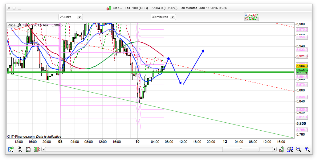 After a fairly bearish Friday and a weak opening to the week in Asia, the bulls have managed to bounce the FTSE quite nicely off the 5850 level and the 10minute chart to start the week doesn’t look as bearish as it could have done. It’s actually showing support from the moving average at 5887, with 5866 below that, so if the bulls come out fighting this morning at 8am, we might well see these levels holding and a rise back up. On the daily chart however, we have 6097 as 25ema resistance so the bulls will need a special week to break back above 6000 and then that area as well. The 30min chart has resistance at 5920 initially which might well cap any early bull activity, but could well give us a dip to load up a long on, if we play out as per the arrows. If the bears break through the 5850 support then the next area of note is 5825 and then 5770