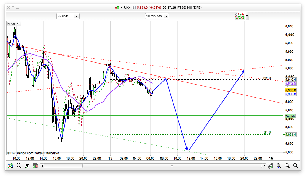 5928 is looking like a fairly key area to start this morning off and a break below this will likely lead to S1 at 5881 and possibly the bottom of that 10min channel at 5860. To start with we have pretty decent 10 minute channel in play with resistance around the daily pivot area at 5950 and this looks like it is worth a short. The bottom of that channel is at 5860 and I am not sure it will get that low, having rebounded strongly overnight from this level already. However, if it does then a double bottom bounce could well be worth a go. It will also be worth trading breakouts of these levels today as its been pretty volatile recently, and a move above 5950 is likely going to try for the top of the 30min channel at 5980. Above this then 6000+ looks likely. My 2 hour chart is showing some bullishness but the bulls really need to start showing some strength to reverse these days of declines as every rise has been rebuffed. They are mostly waiting for the Fed tomorrow of course and a favourable outcome of that for the markets will then likely see 8 days of gains, reversing all this bearishness. We shall see! So in summary weak bull at 5930, better bull at 5870, bearish at 5950 and 5980.