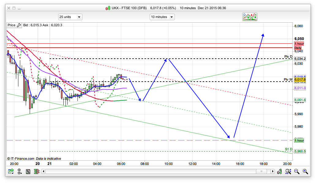 So here we are heading into Christmas week. I expect we will get low volume and increased volatility this week and there is still the possibility of a rally, though I think 6500 might be a bit of a big ask at this late stage, some amazing news not withstanding. Last year the run of daily rises started quite late I seem to remember. However, its not a great sign that the bulls failed to hold onto the recent rises after the rate rise announcement. 6001 looks like its worth a long to start with and the bulls will need to make that stick and break through the daily pivot at 6035 to push higher towards 6100. The long timeframe moving averages are pretty bearish still and the bulls will need to break 6100 today or tomorrow to make inroads into turning them round. On the bearish side, if 6000 breaks then a trip to 5900 again looks likely, with 5808 below that were we have the bottom of the 20 day Bianca. 5913 is the 10 day Raff so I think that this area will hold if we do drop again today.