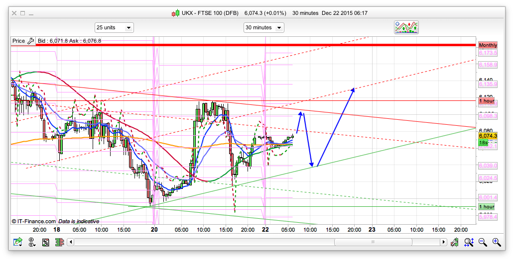 Good morning. Another frustrating day for longs as it appeared the strong rally into Christmas was starting. Unfortunately later in the session the FT100 nose dived along with the DOW to close 17 points lower, having been as much as 60 points higher earlier in the day. Some commentators said it was related to the Spanish elections or the weak oil price but it was quite aggressive when it happened. Commodities and supermarkets featured most in the biggest gainers, whilst oils were in the losers column. Overnight the FT100 has risen from its 6020 low, so not he positive side at least the bulls managed to hold above 6000. Was a bit early with the shorts yesterday going in at 6095 to start with which was a bit unfortunate. As mentioned yesterday, this week will see low volume and increased volatility.