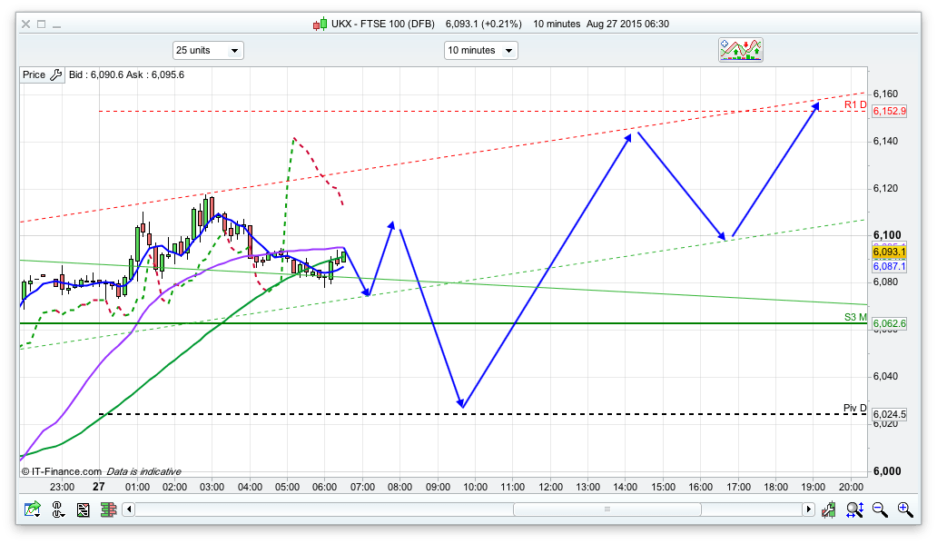 We are starting off fairly positive after a decent US session that saw the S&P and Dow break back above fairly key round number levels (1900 and 16000) by some margin, and off the back of a positive Asia session. We are however just nearing the top of the 10 day Bianca and raff channels at the 6100 area so we may well see a pull back to the daily pivot at 6025 initially, though there is a pretty decent 10min rising channel in play, which has support at the 6075. There is also support on the 30 min at 6075 so the bulls might use this as an entry level to build on last nights gains. If the 6103 holds as resistance it might be worth a short here though to be honest over the next couple of weeks I am still feeling like we will see a bounce and am looking at 17250 on the Dow. That should tally with taking the FTSE back to 6500, so buying the dips does still feel like the right thing to do and I am still thinking that the Fed won’t cut rates in September, reinforced by Dudley’s comments yesterday.