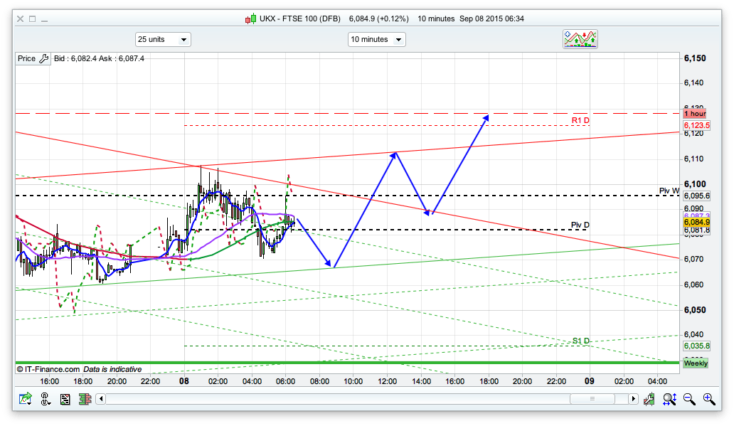 Good morning. Pretty quiet in the end yesterday as the US was closed for Labor Day, not really a greta surprise. We got the rise initially to 6120 as expected but then it was just a slow drift down and hover around 6070 for the rest of the day. On a positive note the FTSE seems to be holding its support above 6000 at the moment so if there is some catalyst for a rise we could be in a good spot for that – maybe something like not raising interest rates?! We are just above the daily pivot as I write this at 6081 so we may get a rise today back above the 6100 area.