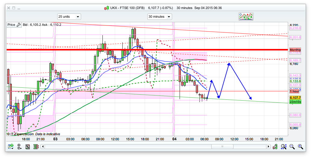 Good morning. Was a little bit too early shorting at 6190 as it popped up to the stop level at 6205 before dropping, though the bulls did fight back following the favourable Draghi press conference about more QE and another ready to do whatever it takes type comment. Overnight hasn’t been quite as favourable for the bulls and we are just above 6100 as I write this, with the NFP news due out today at 13:30. Expect volatility then! Also, US markets are closed on Monday for Labour day so the late afternoon might be a bit quieter. “We have very light volumes, a big U.S. holiday on Monday and with payrolls tonight, investors not doing much besides taking some risk down,” said David Welch, head of equity sales trading at Reorient Group in Hong Kong. “Yesterday’s bounce was artificial with China closed, and with the U.S. payrolls data tonight, people are taking risk off.”