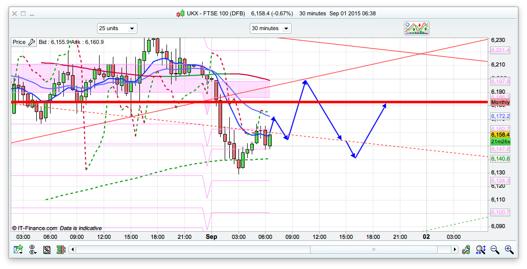 Well after August’s volatility I wonder how September is going to play out… We have dropped off a bit from the high over the bank holiday weekend, at 6230, and with the 200ema on the 30min showing support at 6140.If not then the lower support is 6125 where we have a fib retracement level with 6108 below that. The daily channels are offering support quite far below where we are, mainly as the volatility has been high the channels have widened a lot. Both Raff and Bianca have 5800 area as support, which I don’t think we will be testing today. I am still thinking that we recover from the recent loss for a rise towards 6425ish in September, before another leg down (am looking at 17200 on the Dow or thereabouts). For today I can see a rise towards 6200 initially, and we have the top of the declining 30min channel with resistance at 6226, which joins up the 2 most recent highs (6258 and 6230), as such the bulls will be keen to break that level sooner rather than later. For today I am looking at resistance at 6200, 6225, and support at 6140 and 6108.