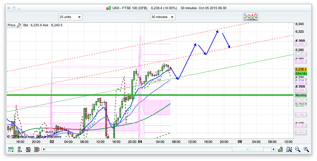 For the moment the trends are pretty firmly up, and there is a chance the Dow will be testing 16600 soon – decent resistance level here if so. I have gone for an initial dip down to the 25ema line on the 30min chart where we have some decent support and also the bottom of the channel. At the moment everything looks pretty hopeful for a rise towards 6300. I have gone for an initial dip as we have some PRT resistance at the 6246 level on the daily charts and its also the overnight high. We have broken out above the Bianca channels (10 day top is 6207 so may get a back test of that level today) and are nearly at the top of the 20 day Raff at 6268 so look around here for resistance as well. All fairly simple in terms of the plan today – go long on any initial dip to 6220.