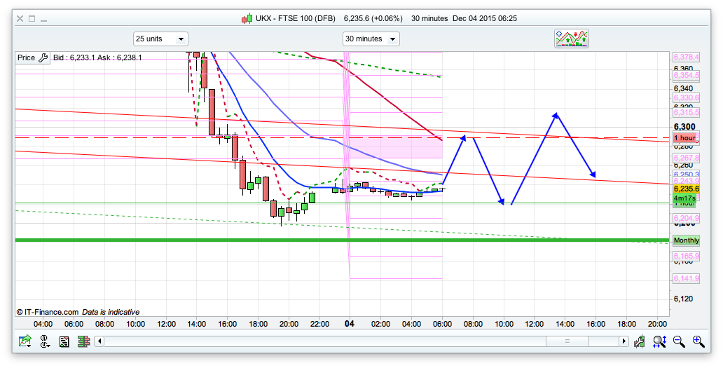 Quite a sell off yesterday and we have US jobs news out today at 13:30 with a forecast of 5% again for the unemployment rate and 200k for the change in NFP. Of course this data will be getting interpreted by the markets to see if Yellen can follow through on her talk yesterday about the economy being strong enough to warrant rate rises. There are quite a few support and resistance levels in play today after just a big swing yesterday, with PRT calculating the range at the moment between 6182 and 6444 – so worth a long at 6182 if seen. I think however that the 6215 might hold initially for a rise towards 6300, mainly as we are testing the bottom of the Raff channels on both the Dax and FTSE at 10700 and 6200 respectively. Initially the bulls need to break 6250 on the 30min chart as we have 25ema resistance here, and it would be the first touch since the cross to bear yesterday at the 6411 area. So, NFP Friday after a massive sell off so likely to be jittery, however the overnight low of 6200 has held and there is the possibility for a rise back to the 6300 level.