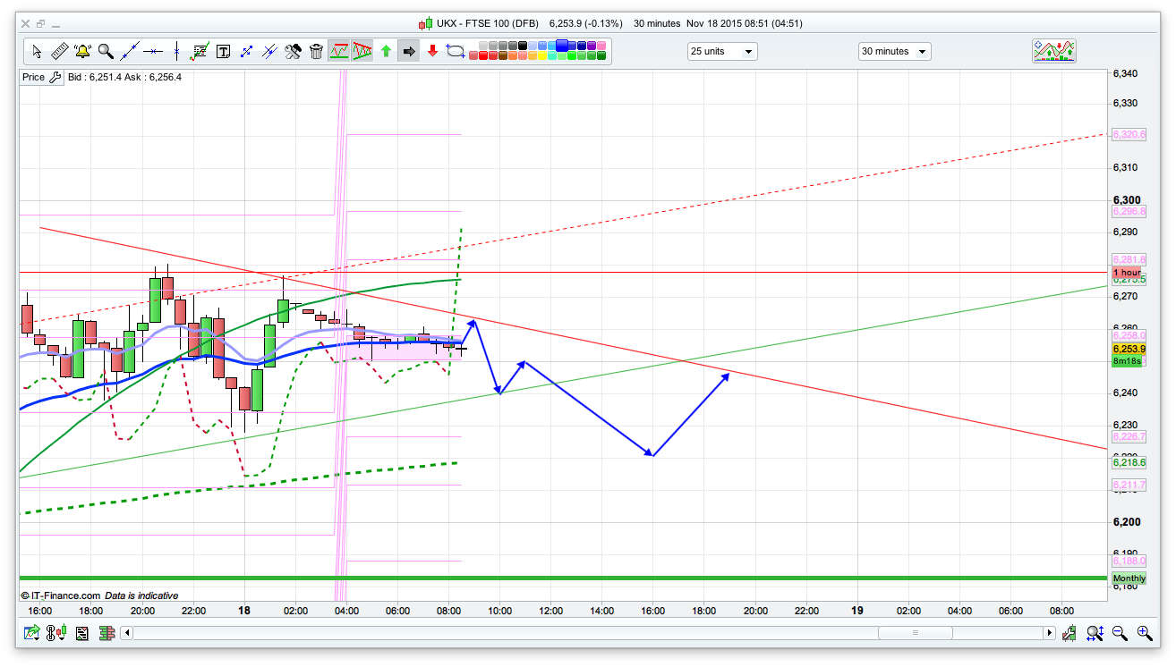 Good morning. Dipped form the 6245 down to 6215 for the shorts and long to play out though didn’t quite reach the 6285 short level before the bell. The FT100 had a powerful rally today on the back of expectations of further ECB stimulus and by Greece’s preliminary deal with its international lenders on home foreclosures. The only sector to miss out on the rally was commodities with some commodity prices falling to new lows, this in part due to expectations of a interest rate rise in the US in December and weak demand from China. In the short term it feels like the market is doing well but at the 6250 area this is really quite low and is far off the 6700 levels seen in August. Everyone seems to think there will be a “Santa Rally” and if enough people think it will happen then it probably will! – maybe 6500 would be a conservative target for year end.