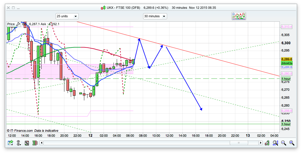 It looks to have initial support at 6284 as I am writing this so I wouldn’t be surprised if we get an initial rise to start things off at 7am. There is then a declining PRT channel on the 30minute chart with resistance at 6303, so this level is fairly key to start with – if the bulls break this then there is a rise to 6345 on the cards, whereas, if the bears defend that level then a decline to 6250 looks likely. Not too much range to play with first thing with arguments for both scenarios at the moment so will be interesting to see which one plays out. If the 6303 short fails then it will be worth flipping to long, and if 6284 breaks to the downside its worth flipping to short for a run down to 6250, and possibly 6236 where we have the bottom of the 10 day Bianca channel.