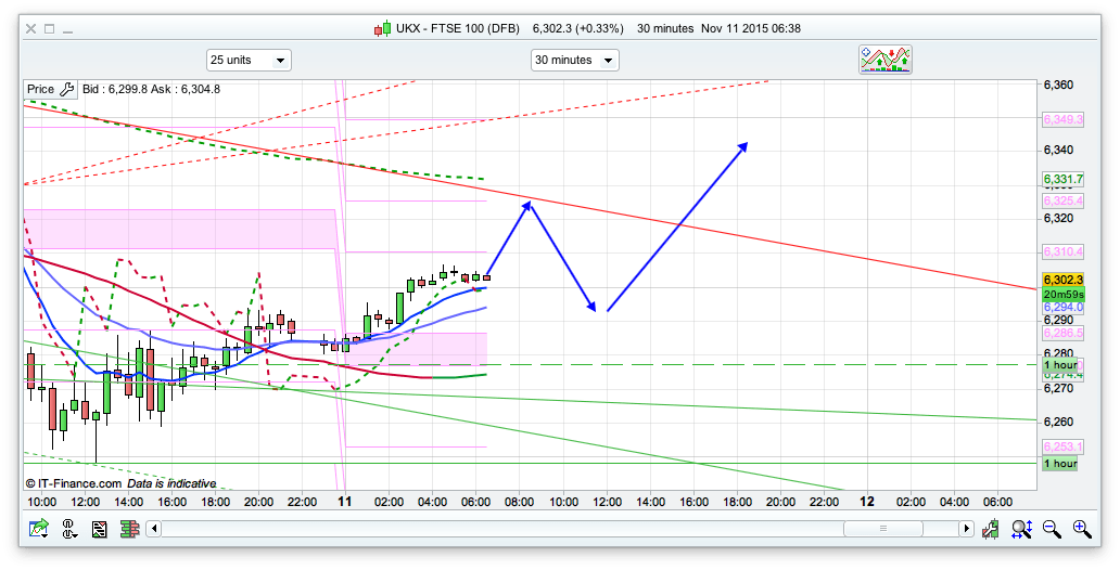 Good morning. Yesterday it appeared the markets would move higher in the morning and push up towards 6350 however after the FT100 opened it was soon clear things were turning negative. Once 6300 had been broken a couple of times to the downside then it was one way traffic until 6250 with the markets managing a minor rally near the close to 6275. It appears the main catalysts were fears of the Portugese banking system together with remaining fears of a US interest rate rise in December and therefore a stronger dollar. So the sectors to suffer most were commodities (which always seem to suffer on a strengthening dollar) and domestically supermarkets on ever decreasing margin worries. Some strength has appeared overnight with a retest of the 6300 area, and support forming at 6293 to start the day. Will we rise to the 10 day Bianca at 6354?
