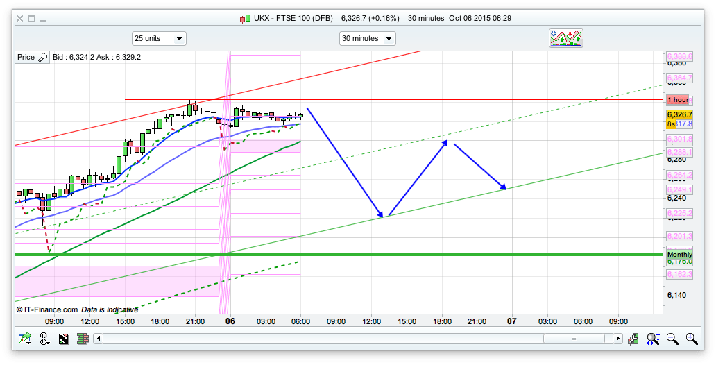 My bullishness has weakened today and I wouldn’t be surprised if we get a dip down to the 6220 area from where we are as I am writing this (6320) to test the bottom of the 30min channel. Below that we have the 30min 200ema at 6180ish, along with a major PRT support line. A mentioned above I am always a bit wary when we have a few up days on the trot, especially trending ones as its like its risen too far too fast, everything becomes over extended and therefore I expect a snap back at some point – same as if it drops too far too fast. So, for today I think a short now to target at the very least the daily pivot at 6288, and possibly 6220 below that. If the bulls defend that level then a rise back to the 6300 level and a period of consolidation after the recent rises while we await the next bit of news! My 10min chart is bearish to start the day, whilst the 30min is still bullish, but with the gap between the moving averages narrowing – so early bear will more than likely lead to a cross and a bear signal.