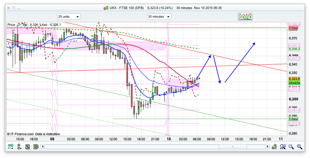 Feeling slightly more bullish today and we have a bullish set up on the 30minute chart just materialising as I write this, so if the 6315 level holds as support we could get a rise to test 6355 and possibly higher. There is a dividend of 11.7 for tomorrow as well, though not massive, it worth remembering. All that said, there is a fairly decent declining 30min channel so the bulls will have a bit of a job to break the 6355 area – we also have resistance here on the 2 hour chart. If they do break it then a rise towards the top of the 10 day Bianca at 6397 is likely. The 10min chart also infers an initial rise this morning with positive moving averages for the bulls and a rising trend line.