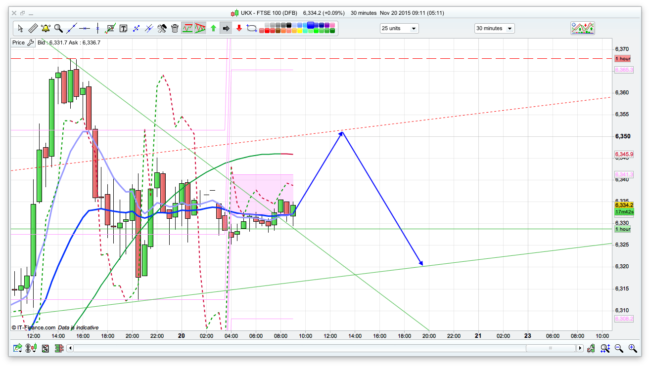 Bit more bullish than I expected yesterday with an eventual rise to the top of the Raff channels at the 6370 area, as minutes from the Federal Reserve’s last meeting reassured investors the world’s biggest economy can withstand higher borrowing costs.. However, from there the bears reappeared with a dip back down. Looking at the 30minute chart there is more resistance than support on the face of it so I am favouring a slight dip today. We have resistance at the 6345/50 area so I think that any early bullishness might get tempered here, and we see a dip down to 6320 or lower.
