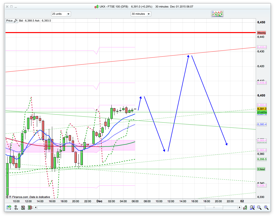 As mentioned above its a bit of wait and see till the ECB on Thursday and what, if any, stimulus measures might be announced. We also have a commons vote on Wednesday about bombing Syria, though markets have largely remained unperturbed by this. Anyway, onto today. We have the pivot at 6363 so I think we may see some support here initially, though the 6326 area is support below this where we have the 10 day Bianca channel and yesterday’s low – so worth a long at this level if it gets this level. Resistance wise we have 6400 as the main attraction, with 6425/6430 above that and worth a short from. It’s the first day of the new month so usually slightly bullish as there is the influx of new money for the month, but any initial rise to the 6430 area this morning could easily reverse. Gold has moved up off its recent lows, and we had a bullish ASX session today, so there is a slight bullish tinge to todays proceedings!
