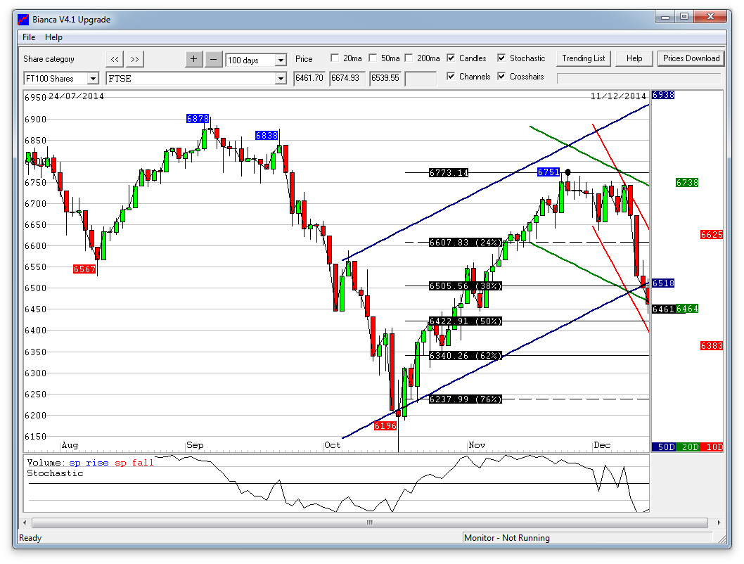 Good morning. Well, it managed to hold that 6440 support area during the day yesterday, but what the hell happened in the evening? When the dam gave way the floodgates opened and we dropped to the bottom of the 10 day Bianca at 6383 in one move virtually! Oil broke below $60 a barrel – no surprise there really. The bulls need to regain some ground today to keep the hopes for a Santa Rally alive, otherwise we are on a pretty slippery slope (and those predictions for a year end around 6900 from he banks will miss by miles!). The S&P managed to hold onto its 2020 support, just as well as it had a large range as well, hitting a high of 2055 during the session. Looking at the FTSE Bianca chart, below 6383 we have the 62% fib at 6340, daily key support here.