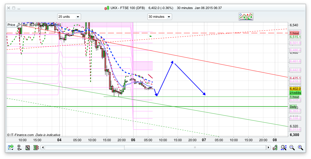 Well the immediate future could be ok, but longer term it all looks pretty bleak unless the FSTE can rise above 6610…. a bit of a big ask right at the moment! I have resistance at the daily pivot at 6466 initially, and a good place to “short the rally”, with 6528 (25ema on daily) then 6552 as resistance above that which is the top of the 10 day Raff. With such a strong downtrend running to start this year I can’t see the bulls breaking much above that but if there do then 6610 to 6619 is a resistance area next. Support wise for today, initially last night low 6384 is support and then the PRT 30 minute channel at 6372. If that breaks then a drop down to 6290 looks quite possible. Bear in mind that the pattern last year was bear Monday then a (usually weak) bull Tuesday. Below 6290 then 6195 and 6090 beckon. Theres quite a lot of bearishness in the mainstream media etc, some even touting 3600 level. Shorting the rallies for the moment is a good plan, though I think we may find some support at 6338 where the 2 Raffs are.
