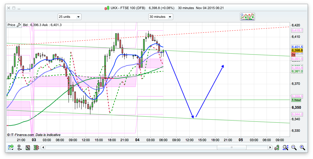 Initially the 10 minute chart looks bearish as we have had a moving average cross overnight, setting up resistance at the 6404 area. There is also a rising 10 min channel with resistance at 6414, and with R1 at 6423 I think once again we will see an initial dip from this area. We are just at the top of the 10 day Raff at this level so the bulls might have a bit of a job to break through that, though there is still a chance that we see the top of the Bianca channels at 6447. We have a 5.24 divi later as well, though I don’t think that is sizeable enough to bring out many divi hunters, but bear it in mind if you hold a position on your platform when it is applied. At the moment the 30min moving averages are still bullish, with support at 6397 and then 6380, so any early bearish activity will need to break these two levels. Its always a little bit dubious when the S&P starts making all time highs as that will only last so long before we get a pullback, so don’t fall in love with the upside as they say.
