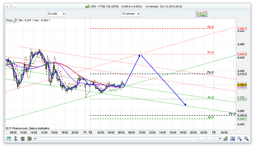 I have gone for an initial rise, mainly as the 10 minute chart has a slight bullish element and the 6400 level has held well as support since Fridays drop from the 6454 area. That said I am feeling bearish so looking to short at the pivot at 6416 today, with also a possible 6445 short if it got that high for a dip down towards 6350 and possibly 6250 this week. Looking at the Dow there is resistance at the 17150 area, and a dip back to 15000 over the next few weeks before a rise to close the year back at 17000 looks a possible route. if that came to pass that obviously means the FTSE would follow a similar route with a drop from this area before a year end rise. The 2 hour chart has gone bearish and has the resistance at 6445, as well as the top of that ascending 10min channel, and the first of the upper fibs there too. As such I think 6445 represents a decent shorting area (if not already holding from Friday). I am looking to short the rallies today.