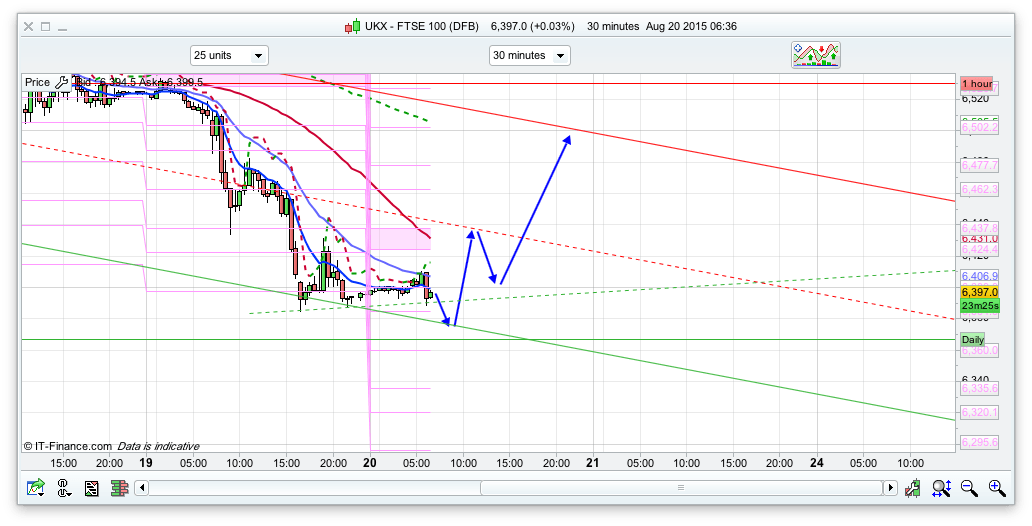 Good morning. Those 2 longs worked out quite well yesterday despite it being a bearish day overall. The Fed minutes came out at 7pm and alluded to no rush to raise the rates unless the were more confident inflation was moving towards their goal. China worries persist with another bearish day there, with global growth concerns still weighing heavily on the markets. There was a quick sell off just before the bell on the FTSE yesterday, sometimes indicative of a last rush for the exit before the bulls reenter. Having now hit the 6400 area it will be interesting to see what plays out today and if this area holds at all (6400/6367)